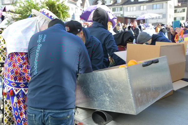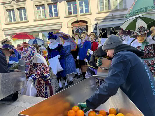 Die Fassmannschaft wartet mit dem Orangenwagen vor den Restaurants, um den Maschgraden die Körbe und Säcke mit Orangen, Mutschli, Servelats und Süssigkeiten zu füllen.